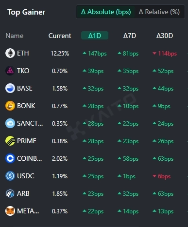 인공지능(AI)기반 웹3 서치 플랫폼 카이토(Kaito)의 토큰 마인드셰어(Token Mindshare, 가상자산 시장 내 특정 토큰의 영향력을 정량화한 지표) 탑게이너에 따르면 6일 현재 사람들이 가장 많이 관심을 보이고 있는 가상자산 종목 상위 5개는 이더리움(ETH), 타이코(TKO), 베이스(BASE), 봉크(BONK), 생텀(SANCTUM) 등이다.