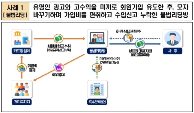 불법 리딩방 업체 A사는 유명 연예인을 앞세워 ‘무조건 300%’, ‘환불 보장’ 등 과대·허위광고로 유료 회원을 끌어모았다. 수천만원에 달하는 연회비를 깎아준다며 카드깡 업체를 통해 현금결제를 유도하는 등의 수법으로 100억원대의 수익을 은닉하고 신고도 누락했다. 법인이 보유한 상표권을 사주 개인 명의로 출원·등록한 뒤 법인에 10억원에 파는 것처럼 서류를 꾸며 법인자금을 유출하기도 했다.