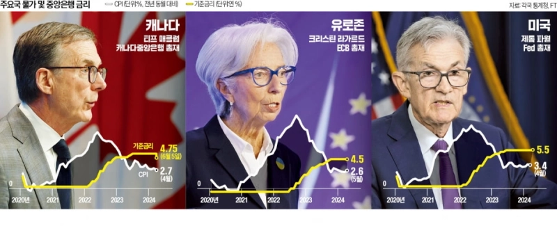 ECB와 미국 Fed 등 다른 주요국 중앙은행들도 금리 인하 행렬에 곧 합류할 것으로 점쳐지고 있다. 유로존의 물가상승률(CPI)도 캐나다와 마찬가지로 꾸준히 3% 아래에 머물고 있다. ECB는 이달 금리 인하를 결정할 가능성이 크고, Fed는 오는 9월께 금리를 인하할 것이라는 기대감이 시장에 퍼져 있다. 엔화 가치 절하 문제가 심각해지면서 최근 금리를 인상한 일본 정도가 예외로 꼽힌다.