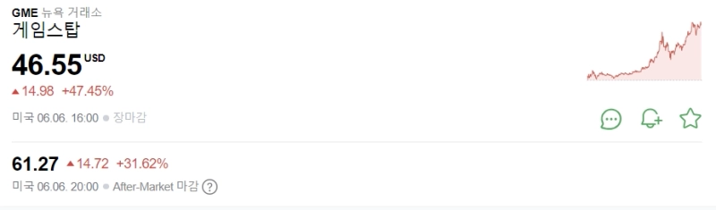 6일(현지시간) 게임스탑은 뉴욕 거래소에서 전일대비 47.45% 급등한 46.55달러로 장을 마감했고, 이후 현재 장외거래에서도 종가대비 31.62% 상승한 61.27달러를 기록 중이다.