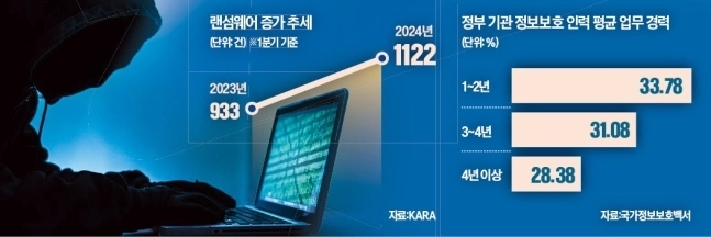 해커들의 공격이 계속 늘고 있지만 이를 막아야 할 보안 인력 양성은 지지부진하다. ‘2023 국가정보보호백서’에 따르면 2022년 기준 기관별 정보보호 전담 인력의 평균 업무 경력은 1\~2년 33.78%, 3\~4년 31.08%, 4년 이상 28.38%로 조사됐다. 보안 업계에 숙련 인력이 많지 않다는 얘기다.