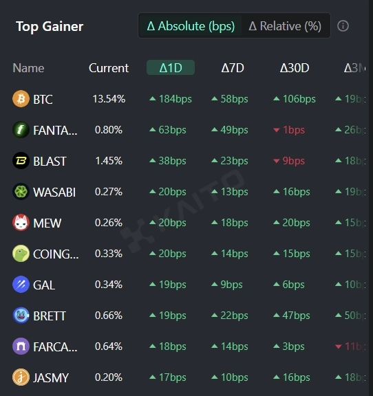 인공지능(AI)기반 웹3 서치 플랫폼 카이토(Kaito)의 토큰 마인드셰어(Token Mindshare, 가상자산 시장 내 특정 토큰의 영향력을 정량화한 지표) 탑게이너에 따르면 8일 현재 사람들이 가장 많이 관심을 보이고 있는 가상자산(암호화폐) 키워드 상위 5개는 비트코인(BTC), 판타지탑(FANTASY), 블라스트(BLAST), 와사비(WASABI), 캣인어도그스월드(MEW)다.