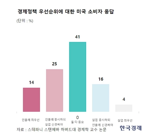 또 '미국 정부가 어떤 경제 정책을 우선 해결해야 하나'라는 질문에 인플레이션이 최우선이라고 응답한 소비자 비율은 14%로 실업이 최우선이라고 응답한 비율(4%)의 3배가 넘었다.