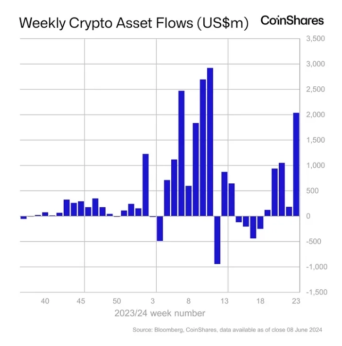 10일(현지시간) 가상자산(암호화폐) 운용사 코인셰어즈는 '주간 디지털 자산 상품 내 자금 유입' 보고서를 통해 "지난주 20억달러의 대규모 자금이 디지털 자산 투자 상품으로 유입됐다"라고 밝혔다. 디지털 자산 투자 상품은 5주 연속 순유입을 기록했고 43억달러의 자금이 유입됐다.
