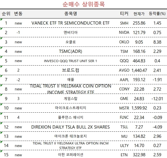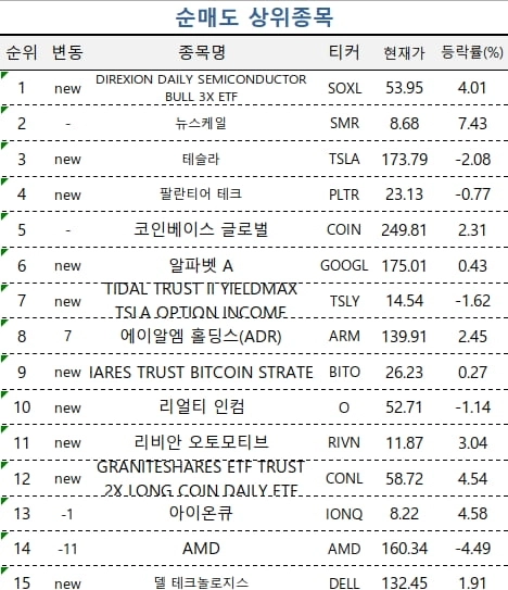 이외에도 테슬라, 팔란티어 테크, 코인베이스 글로벌, 구글 모회사 알파벳A에도 순매도가 집중됐다.