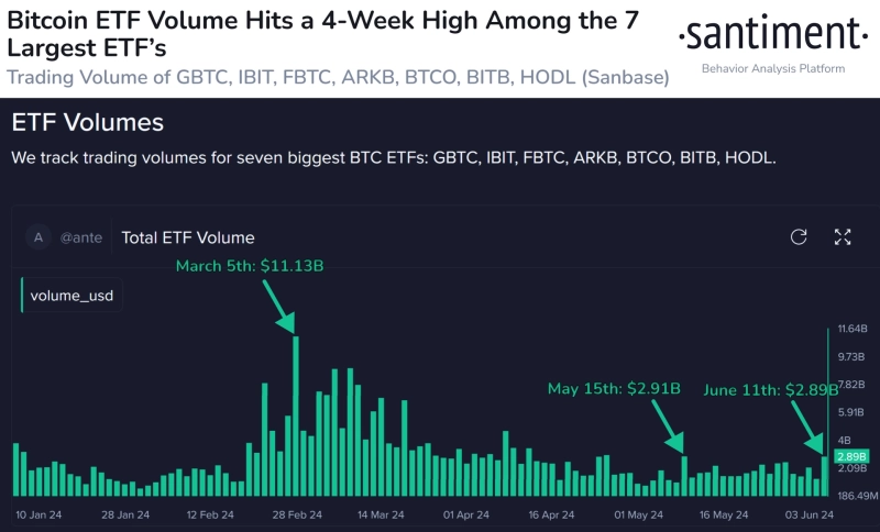 11일(현지시각) 가상자산(암호화폐) 온체인 분석 플랫폼인 샌티멘트(Santiment)는 X를 통해 "상위 7개의 비트코인 현물 ETF의 거래량이 지난 달 15일 이후에 최고 수준으로 급증했다"라며 거래량이 늘어날 경우에 가격이 반등할 가능성이 높아진다고 전했다. 이어서 "최근의 급등 역시 하락 매수세에 따른 상승일 수 있다"라고 덧붙였다.