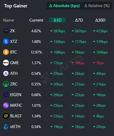 인공지능(AI)기반 웹3 서치 플랫폼 카이토(Kaito)의 토큰 마인드셰어(Token Mindshare, 가상자산 시장 내 특정 토큰의 영향력을 정량화한 지표) 탑게이너에 따르면 12일 현재 사람들이 가장 많이 관심을 보이고 있는 가상자산 관련 키워드 상위 5개는 지케이싱크(ZK), 테조스(XTZ), 비트코인(BTC), 게임스톱(GME), 에이더(ATH) 등이다.