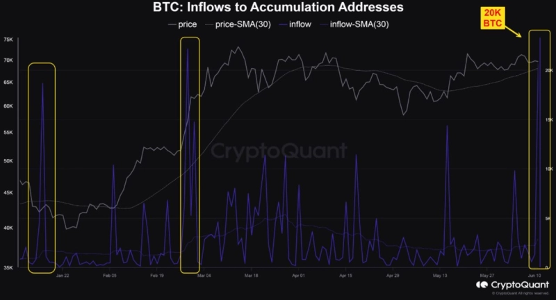 12일 크립토퀀트 기고가 에이브람차트(abramchart)는 "2만 개 이상의 비트코인이 고래들의 지갑으로 유입됐다"라며 "고래들은 어제 비트코인 가격 조정 때 추가 물량을 쌓아둔 것으로 보인다"라고 밝혔다.