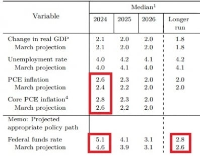 인플레이션 전망치도 소폭 높였다. Fed는 3월 FOMC때 올해 개인소비지출(PCE) 상승률을 2.4%로 전망했는데 이번엔 2.6%로 상향조정했다. 내년 PCE 상승률도 2.2%에서 2.3%로 올렸다.