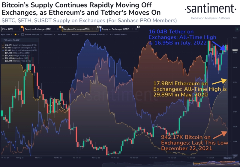 12일(현지시각) 가상자산(암호화폐) 온체인 분석 플랫폼 샌티멘트(Santiment)는 X를 통해 "비트코인의 거래소 유입량은 2021년 12월(94.2만 BTC) 이후 가장 적은 수준"이라며 "역사적으로 비트코인 유입량이 적을 때 전체 가상자산의 매도 압력도 줄었다"라고 전했다.
