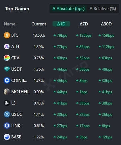 인공지능(AI)기반 웹3 서치 플랫폼 카이토(Kaito)의 토큰 마인드셰어(Token Mindshare, 가상자산 시장 내 특정 토큰의 영향력을 정량화한 지표) 탑게이너에 따르면 13일 현재 사람들이 가장 많이 관심을 보이고 있는 가상자산 관련 키워드 상위 5개는 비트코인(BTC), 에이더(ATH), 커브 다오 토큰(CRV), 테더(USDT), 코인베이스(COINBASE) 등이다.