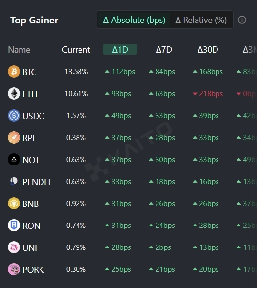 인공지능(AI)기반 웹3 서치 플랫폼 카이토(Kaito)의 토큰 마인드셰어(Token Mindshare, 가상자산 시장 내 특정 토큰의 영향력을 정량화한 지표) 탑게이너에 따르면 15일 현재 사람들이 가장 많이 관심을 보이고 있는 가상자산 관련 키워드 상위 5개는 비트코인(BTC), 이더리움(ETH), USDC, 로켓풀(RPL), 낫코인(NOT) 등이다.