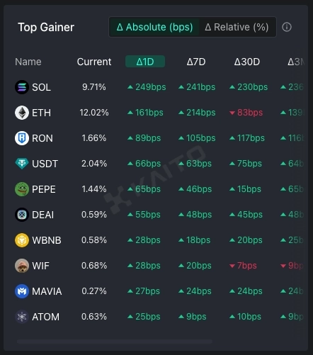 인공지능(AI)기반 웹3 서치 플랫폼 카이토(Kaito)의 토큰 마인드셰어(Token Mindshare, 가상자산 시장 내 특정 토큰의 영향력을 정량화한 지표) 탑게이너에 따르면 16일 현재 사람들이 가장 많이 관심을 보이고 있는 가상자산(암호화폐) 키워드 상위 5개는 솔라나(SOL), 이더리움(ETH), 로닌(RON),페페(PEPE), 테더(USDT) 등이다.