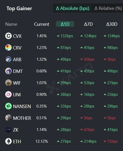 인공지능(AI)기반 웹3 서치 플랫폼 카이토(Kaito)의 토큰 마인드셰어(Token Mindshare, 가상자산 시장 내 특정 토큰의 영향력을 정량화한 지표) 탑게이너에 따르면 17일 현재 사람들이 가장 많이 관심을 보이고 있는 가상자산 관련 키워드 상위 5개는 컨벡스 파이낸스(CVX), 커브 다오 토큰(CRV), 아비트럼(ARB), 드림머신 토큰(DMT), 도그위프햇(WIF) 등이다.