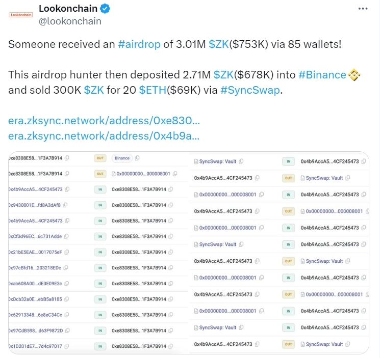 reporter1@bloomingbit.io안녕하세요 블루밍비트 기자입니다.17일(현지시간) 룩온체인에 따르면 특정 계정이 85개 월렛을 통해 301만 ZK를 에어드랍 받은 것으로 나타났다.