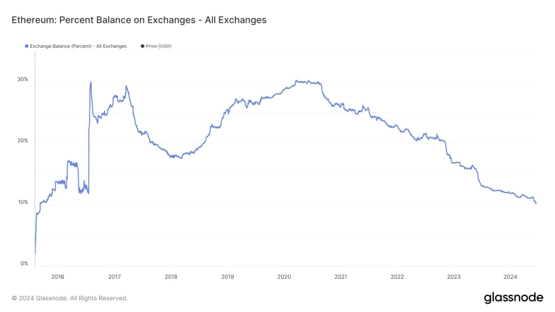 18일 유명 가상자산 분석가 라크 데이비스(Lark Davis)는 X(옛 트위터)를 통해 "가상자산 거래소가 보유한 이더리움 물량은 8년 만에 최저치를 기록하고 있다"라며 "이는 이더리움 순환 공급량의 10% 정도에 불과하다"라고 전했다.