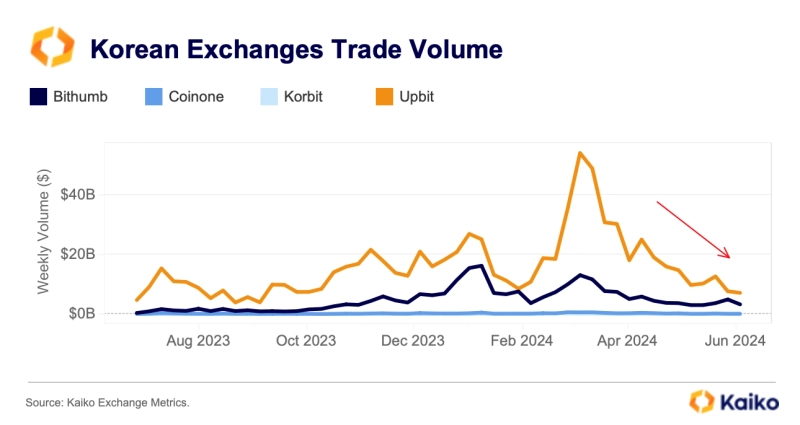 17일(현지시간) 가상자산(암호화폐) 데이터 분석 기업 카이코(Kaiko)는 연구 보고서를 통해 "업비트, 빗썸, 코인원, 코빗의 1분기 평균 주간 거래량은 350억달러(약 48조3700억원)를 기록했지만 이달 초 60억달러(약 8조2900억원)로 감소했다"라고 밝혔다.