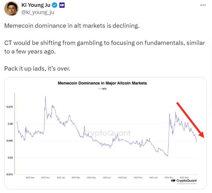 주기영 온체인 분석업체인 크립토퀀트 최고경영자(CEO)가 19일(현지시간) X(구 트위터)를 통해 "알트코인 시장에서 밈코인 도미넌스가 하락하고 있다"라며 "시장은 몇 년 전과 마찬가지로 도박성 투자에서 펀더멘털에 초점을 맞추는 방향으로 전환될 것"이라고 전했다.