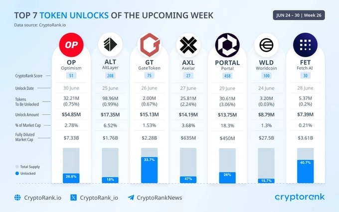 24일 가상자산(암호화폐) 분석 플랫폼인 크립토랭크(CryptoRank)는 X(옛 트위터)를 통해 "이번 주 7종 토큰의 대규모 언락이 예정돼 있다"면서 "OP 3221만개(약 5485만달러), ALT 9896만개(약 1735만달러), GT 200만개(1513만달러), AXL 2581만개(약 1419만달러), PORTAL 3061만개(약 1375만달러), WLD 320만개(약 879만달러), FET 537만개(약 739만달러)가 언락될 예정"이라고 밝혔다.