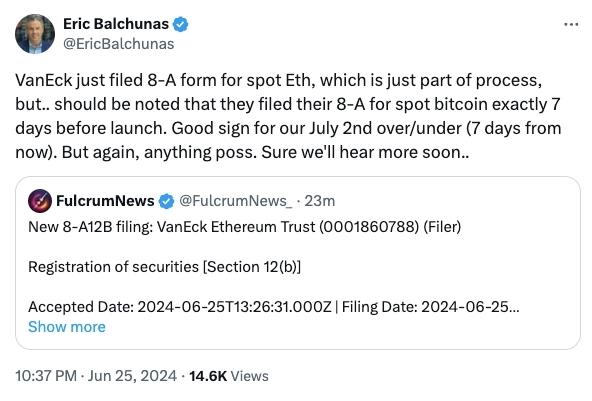 25일 에릭 발추나스 블룸버그 선임 ETF 애널리스트는 X(옛 트위터)를 통해 "반에크가 이더리움 현물 ETF 증권 등록 신청서(8-A)를 제출했다"면서 "지금부터 7일 후인 7월 2일 좋은 (승인) 신호가 될 수 있다"라고 말했다.