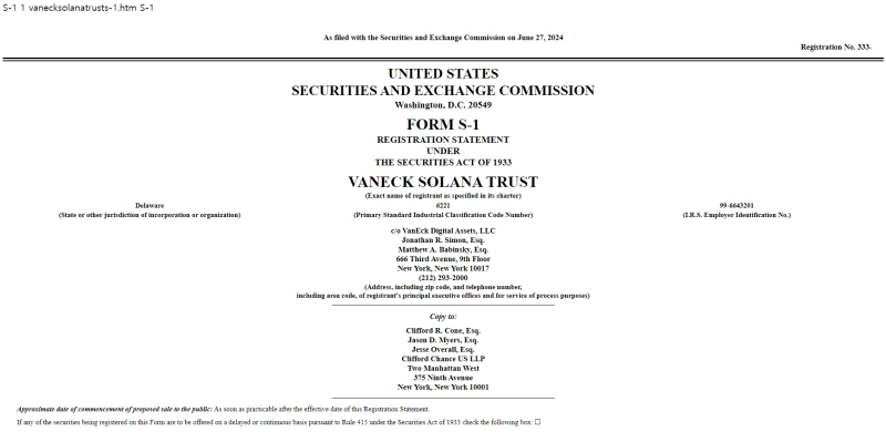 27일 미 증권거래위원회(SEC) 공식 사이트에 따르면 반에크가 SEC에 솔라나(SOL) 상장지수펀드(ETF) 출시를 위한 증권신고서(S-1) 등록 양식을 제출한 것으로 나타났다. 이는 미국에서 최초의 솔라나 ETF 등록 신청이다.