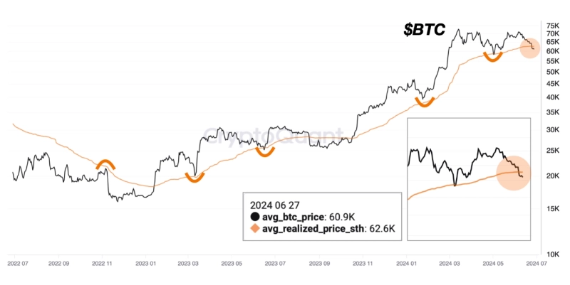 최근 비트코인(BTC)이 하락세를 겪으며 단기 보유자의 실현 가격을 밑돌았던 것으로 나타났다.