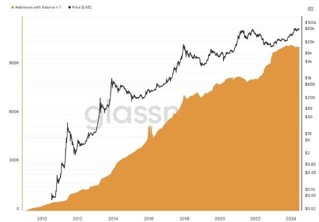 가상자산(암호화폐) 전문매체 코인텔레그래프는 글래스노드 데이터를 인용, 비트코인을 1개 이상 보유 중인 주소 수가 지난 2023년 5월부터 100만개 이상을 유지하고 있다고 보도했다.