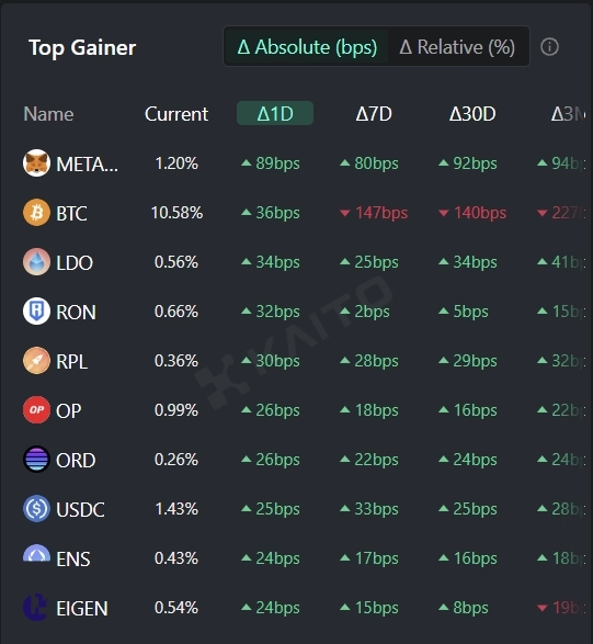 인공지능(AI)기반 웹3 서치 플랫폼 카이토(Kaito)의 토큰 마인드셰어(Token Mindshare, 가상자산 시장 내 특정 토큰의 영향력을 정량화한 지표) 탑게이너에 따르면 29일 현재 사람들이 가장 많이 관심을 보이고 있는 가상자산 관련 키워드 상위 5개는 메타마스크, 비트코인(BTC), 리도다오(LDO), 로닌(RON), 로켓풀(RPL) 등이다.