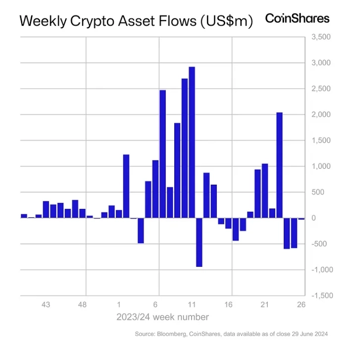 지난주 디지털 자산 투자 상품에서 3000만달러(약 414억원) 규모의 자금이 빠져나갔다.
