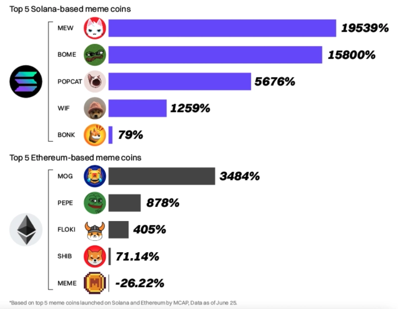 보고서는 "올 들어 솔라나 기반 밈코인은 이더리움 기반 밈코인보다 평균적으로 8배 이상 높은 성과를 올렸다"라고 덧붙였다. 이더리움 밈코인은 평균적으로 962% 수익률을 보인 반면, 같은기간 솔라나 계열 밈코인은 8469% 수익률을 기록한 것으로 나타났다.