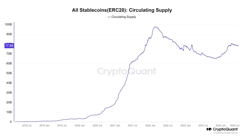 3일(현지시간) 온체인 분석 플랫폼 크립토퀀트(CryptoQuant)는 공식 X(트위터)를 통해 "비트코인은 최고점 경신 이후 횡보 움직임을 보이고 있다. 이는 22년 3월 이후 미국의 긴축 통화 정책 때문으로, 이에 대한 영향으로 스테이블코인 총 유통량 감소가 일어났다"라고 밝혔다.