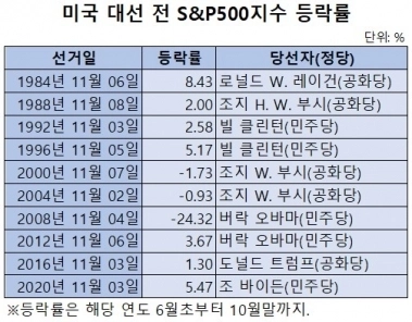 S&P500지수가 가장 많이 오른 해는 로널드 W. 레이건 전 대통령이 당선된 1984년이다. 당시 6월 말부터 10월 말까지 상승률은 8.43%에 달했다. 조 바이든 대통령이 당선된 2020년(5.47%), 빌 클린턴 전 대통령이 당선된 1996년(5.17%)에도 비교적 높은 상승률을 기록했다.