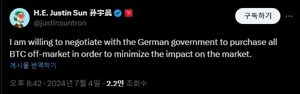 저스틴 선은 4일(현지시간) 자신의 X(트위터)에서 "시장에 미치는 영향을 최소화하기 위해 독일 정부가 보유한 비트코인을 장외에서 매수하기 위해 협상할 의향이 있다"라고 밝혔다.