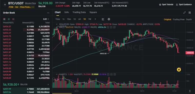 오전 9시 14분 현재 바이낸스 USDT마켓 기준 비트코인은 24시간 전 대비 5.58% 하락한 5만6928달러에 거래되고 있다.