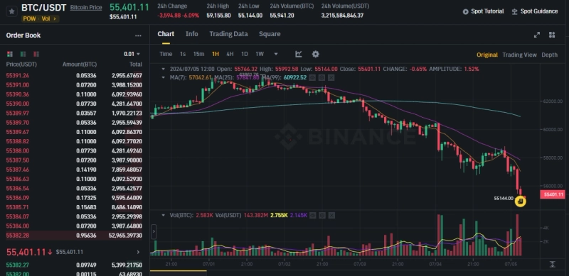 오후 12시 13분 현재 바이낸스 USDT마켓 기준 비트코인은 24시간 전 대비 5.88% 하락한 5만5401달러에 거래되고 있다.