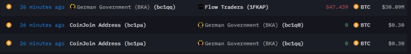 아캄인텔리전스 데이터에 따르면 독일 정부 소유 추정 주소가 3000만달러 상당의 비트코인(547BTC)을 유동성 제공자 플로우 트레이더스 소유 지갑으로 전송했다.