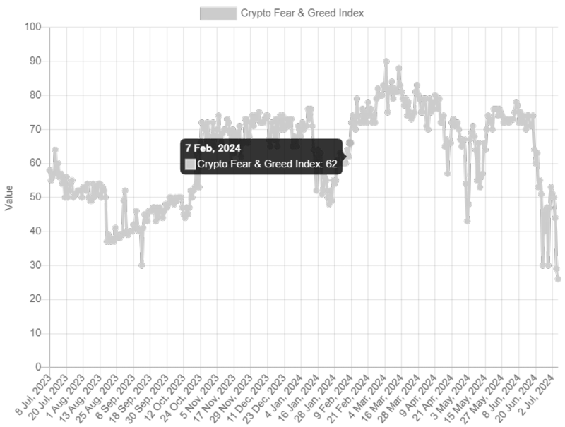 가상자산(암호화폐) 공포·탐욕 지수가 1년 사이 최저치를 기록했다.