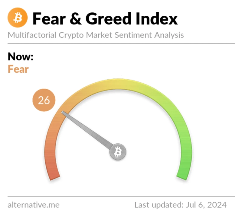 6일 가상자산 데이터 제공 업체 얼터너티브에 따르면 가상자산 공포·탐욕 지수는 전일대비 3포인트 내린 26을 기록했다. 전날 비트코인(BTC)이 마운트곡스 상환 여파로 급락하면서다.