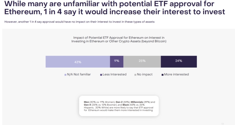 6일 그레이스케일의 선거 관련 분석 리포트에 따르면 미국 유권자 중 약 24%는 '이더리움 현물 ETF가 승인된다면 이더리움 및 다른 가상자산 투자에 투자를 고려하겠나'라는 질문에 '더 관심이 생길 것'고 답했다. 다만 해당 질문에서 가장 많은 비율을 차지한 답변은 '관심 없음'(43%)이었고, 이어 '영향 없음'(25%), '관심 줄어들 것'(9%) 순이었다.