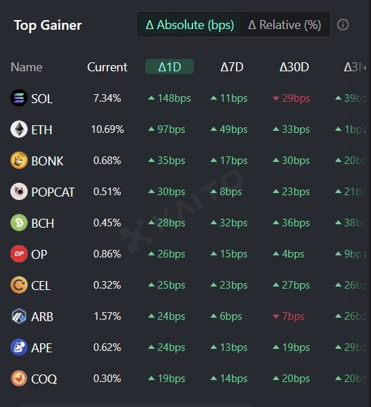 인공지능(AI) 기반 웹3 서치 플랫폼 카이토(Kaito)의 토큰 마인드셰어(Token Mindshare, 가상자산 시장 내 특정 토큰의 영향력을 정량화한 지표) 탑게이너에 따르면 6일 현재 사람들이 가장 많이 관심을 보이고 있는 가상자산 관련 키워드 상위 5개는 솔라나(SOL), 이더리움(ETH), 봉크(BONK), 팝캣(POPCAT), 비트코인캐시(BCH) 등이다.