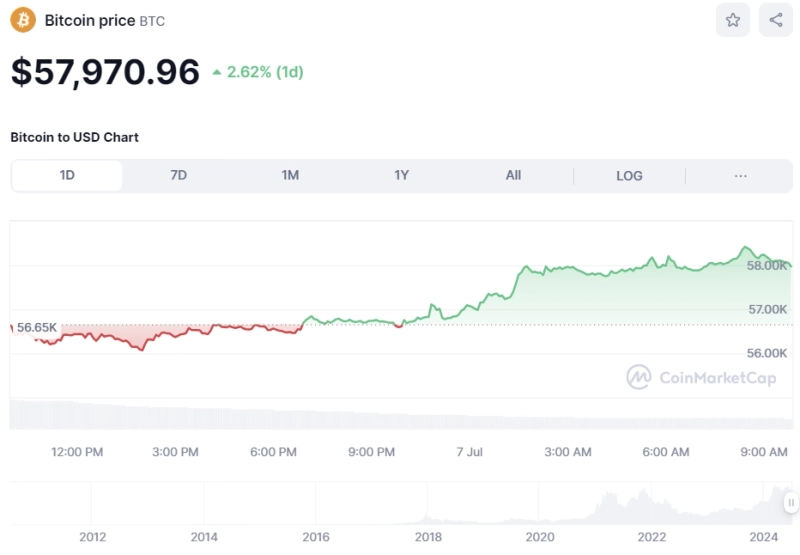 7일(한국시간) 오전 10시 현재 비트코인은 코인마켓캡 기준 전일대비 2.41% 상승한 5만7975달러를 기록 중이다. 비트코인은 지난 5일 마운트곡스 상환, 독일과 미국 정부의 매도세로 인해 가격이 5만4000달러대까지 하락했으나 현재는 가격을 소폭 회복한 모양새다.