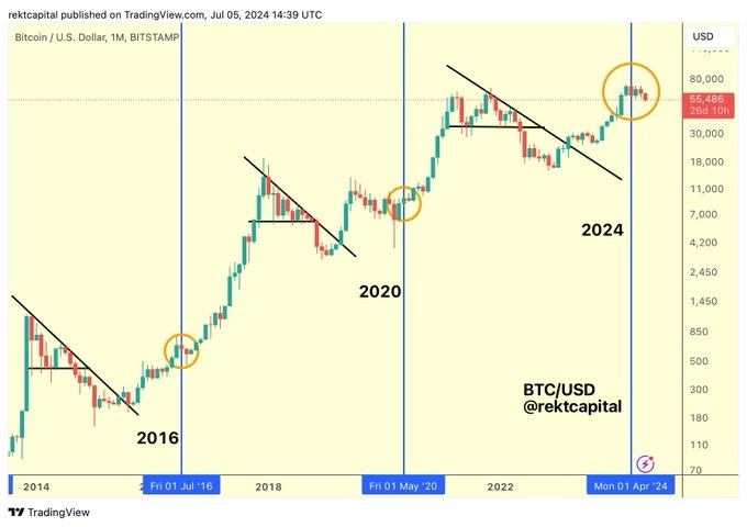 또 가상자산 트레이더 렉트 캐피털도 X를 통해 "이번 조정은 비트코인의 반감기 이후 나타나는 전형적인 사이클이다"라고 말했다. 실제 그가 공유한 차트에 따르면 앞서 비트코인은 2016년, 2020년 반감기 이후 나타난 조정장을 거쳐 큰 상승세를 보였다.