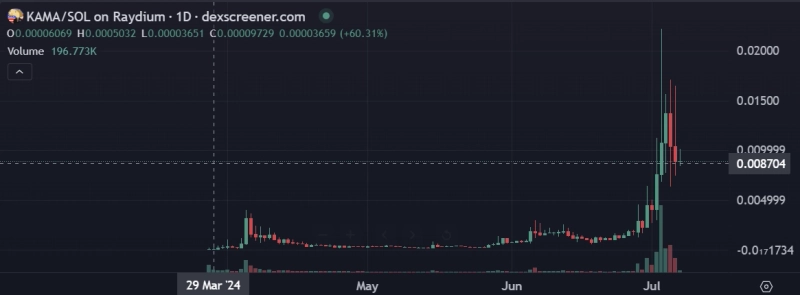먼저 바이든 대통령을 테마로 만들어진 제오 보든(BODEN)은 지난 TV토론 이후 가격이 35% 급락했다. 7일 오후 4시 현재 제오 보든은 전일대비 1.87% 하락한 0.037달러를 기록 중이다. 반면 같은시간 카멀라 해리스를 주제로 한 밈코인 카말라 호리스(KAMA)는 전일대비 23.8% 급등한 0.014달러에 거래됐다. 특히 바이든 후보 교체설이 제기된 지난 3일에는 하룻동안 가격이 약 400% 폭등하기도 했다.