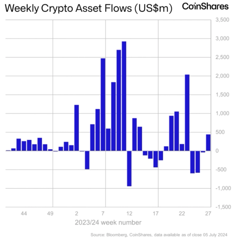 8일(현지시간) 가상자산 운용사 코인쉐어즈는 주간 디지털자산 상품 자금 흐름 보고서를 통해 "지난주 디지털자산 투자 상픔에는 총 4억4100만달러의 유입이 나타나 4주만에 유입세 전환이 일어났다"라고 전했다.