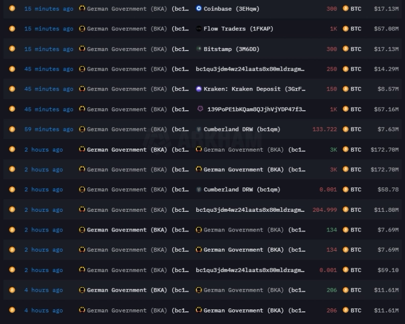 독일 정부가 지난 1시간 동안 3000BTC를 넘는 코인을 전송한 것으로 나타났다.