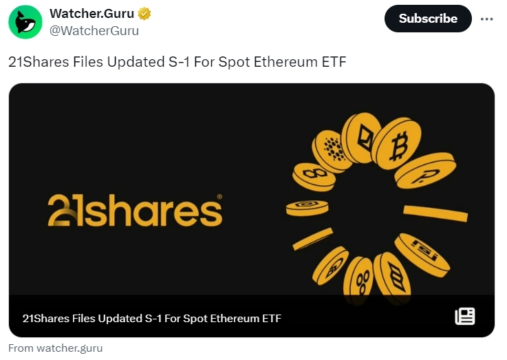 가상자산(암호화폐) 전문 미디어 워처구루가 8일(현지시간) X(구 트위터)를 통해 "21쉐어스가 이더리움(ETH) 현물 상장지수펀드(ETF) S-1(증권신고서) 수정안을 제출했다"고 전했다.