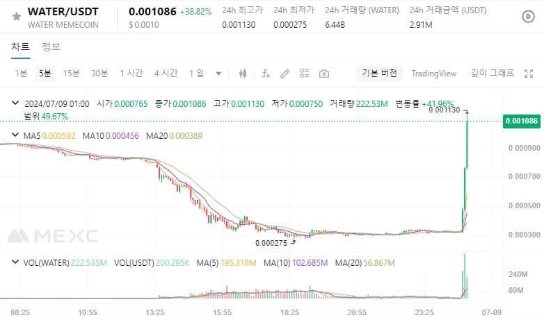- 코인마켓캡 기준 워터는 현재 전일 대비 약 80% 상승한 0.00091달러에 거래되고 있다고 밝혔다.
