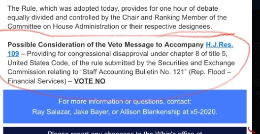- 그녀는 "미국 하원은 SAB 121을 유지하기로 결정한 바이든의 거부권을 지지할 것"이라며 과반수를 확보하지 못할 것으로 전망한 바 있다 전했다.