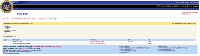 블랙록이 이더리움 현물 ETF 관련 상장 신고서(8-A12B)를 제출한 것으로 나타났다.