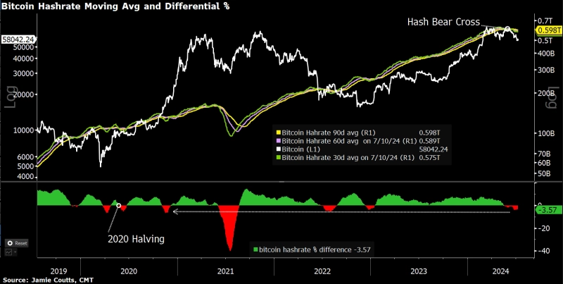 10일(현지시각) 제이미 쿠츠 블룸버그 인텔리전스 가상자산 분석가는 X를 통해 "비트코인 해시레이트 하락세가 둔화되고 있다"라며 "이는 일반적으로 비트코인이 바닥에 도달하고 하락세 반전이 일어나기 전에 발생하는 현상"이라고 말했다. 이어서 "시장은 여전히 오버행을 소화 중"이라고 덧붙였다.